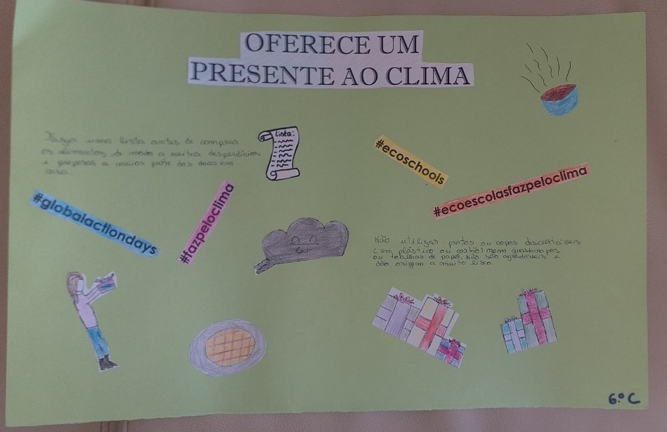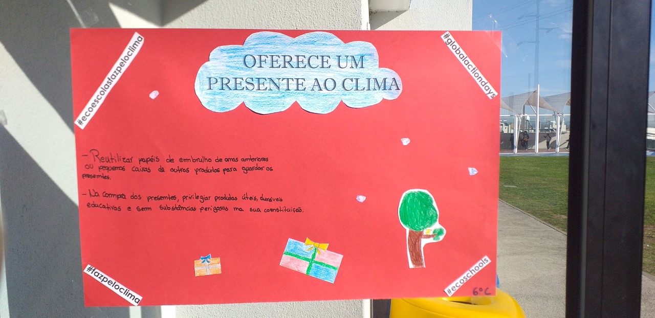 Os alunos do 2.º ciclo elaboraram alguns cartazes que visam a sensibilização da comunidade escolar para algumas medias que permitem festejar a quadra natalícia de um modo mais sustentável. Com o título “Oferece um presente ao clima”, foram elaborados suportes escritos com algumas frases, devidamente ilustradas e acompanhadas com as hashtags da campanha.
