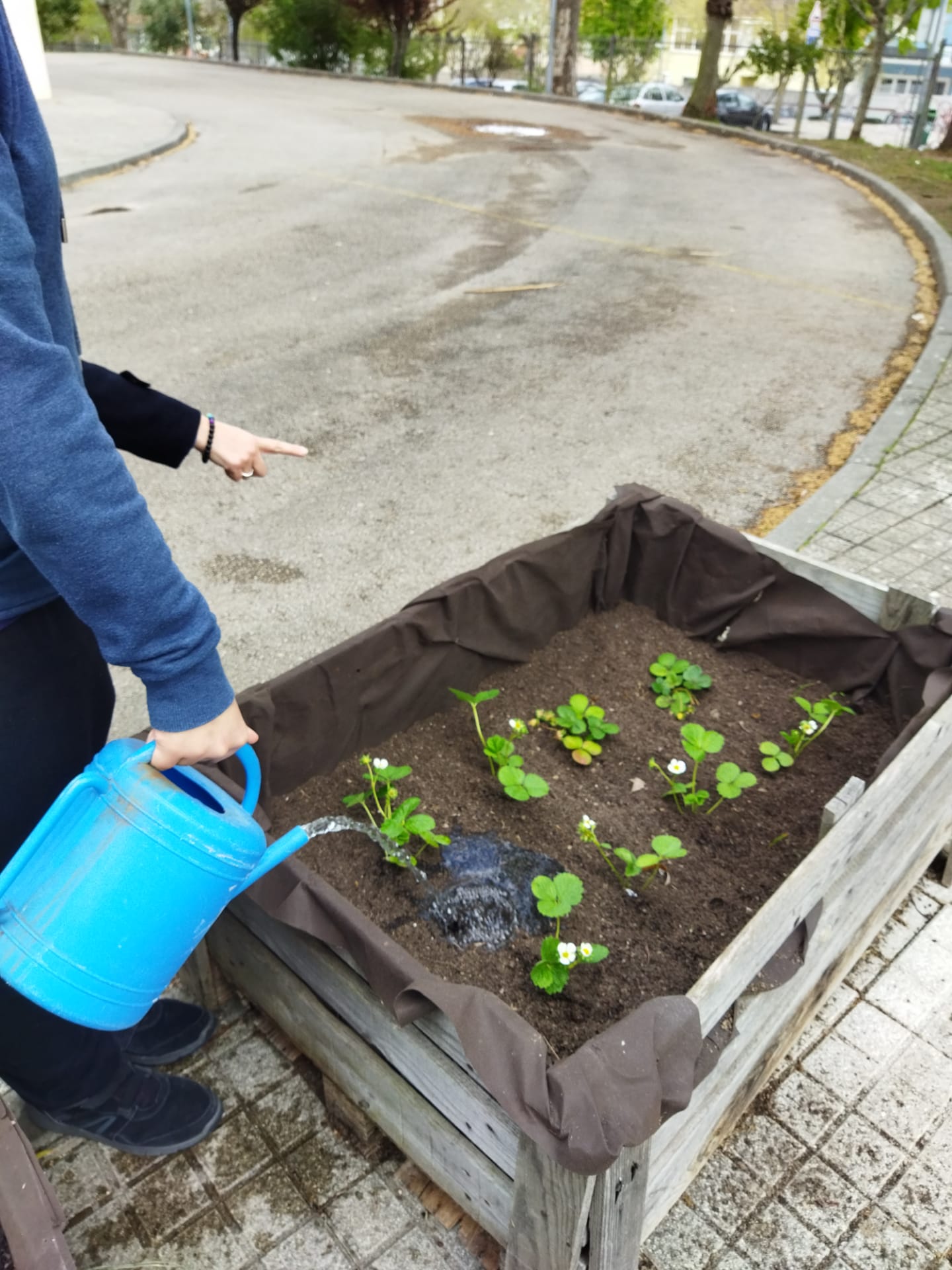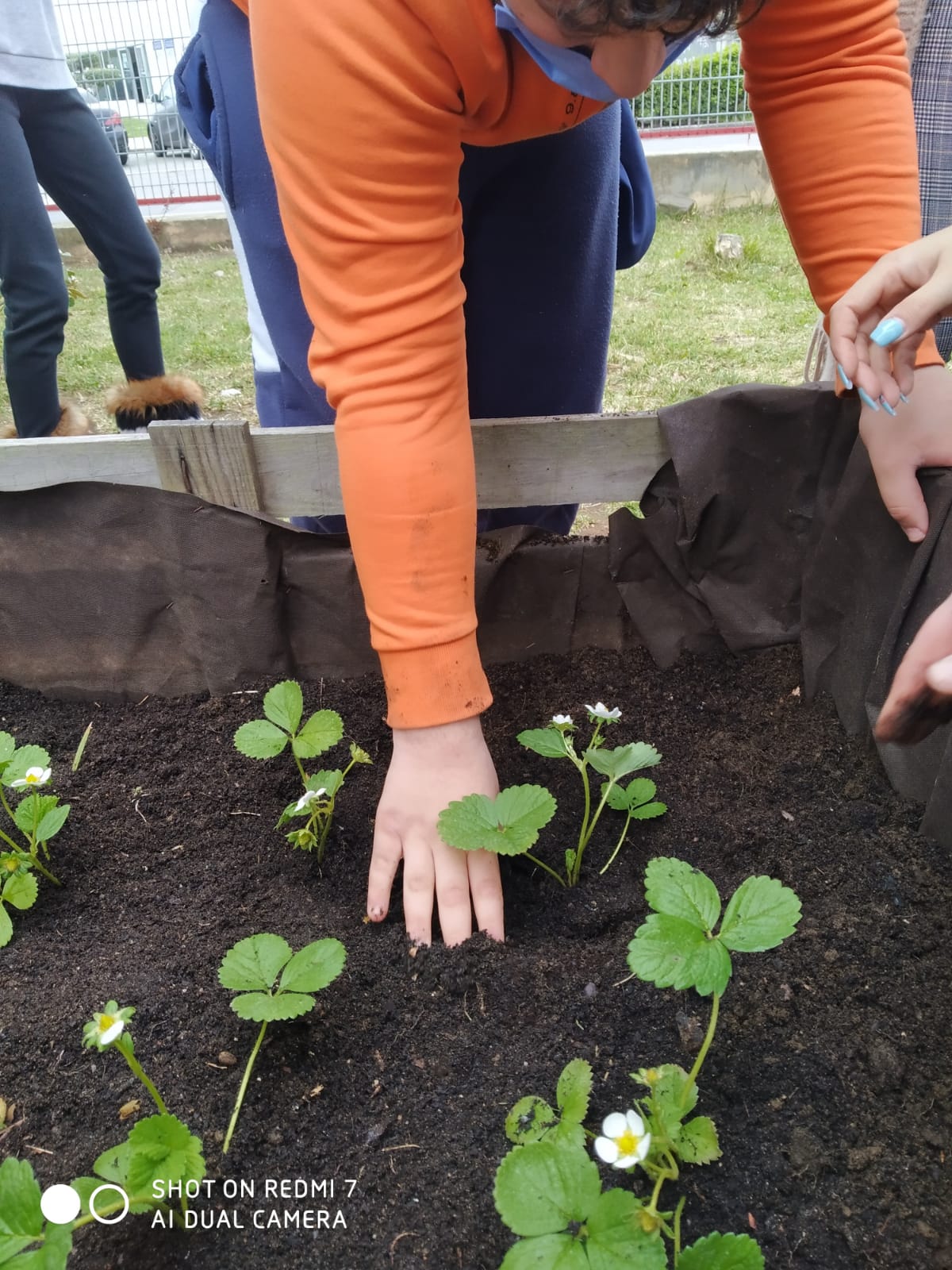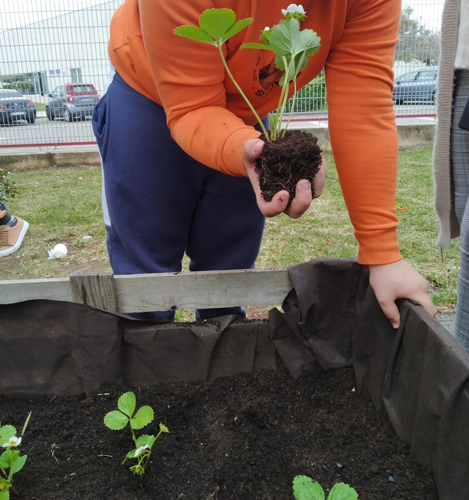 Os alunos da Unidade de Apoio Especializado/Centro de Apoio à Aprendizagem procederam, com o auxílio das docentes de Educação Especial e das assistentes operacionais que os acompanham, à plantação de morangueiros e à manutenção dos canteiros da horta biológica que existem na Escola Básica Vasco Santana.