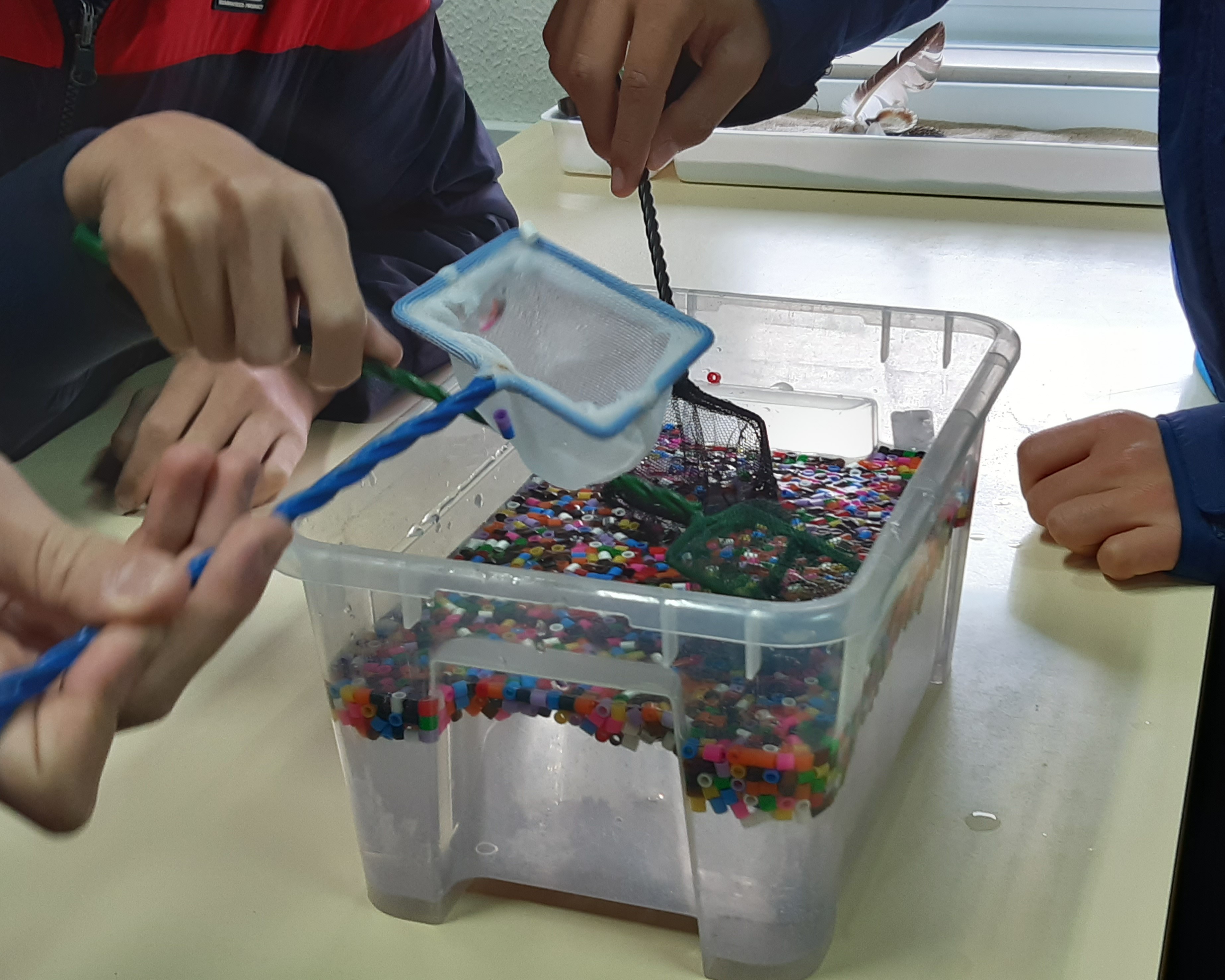 – Dinamização de uma dinâmica simples para exemplificar a dificuldade dos animais marinhos em obter alimentos no meio da poluição.
