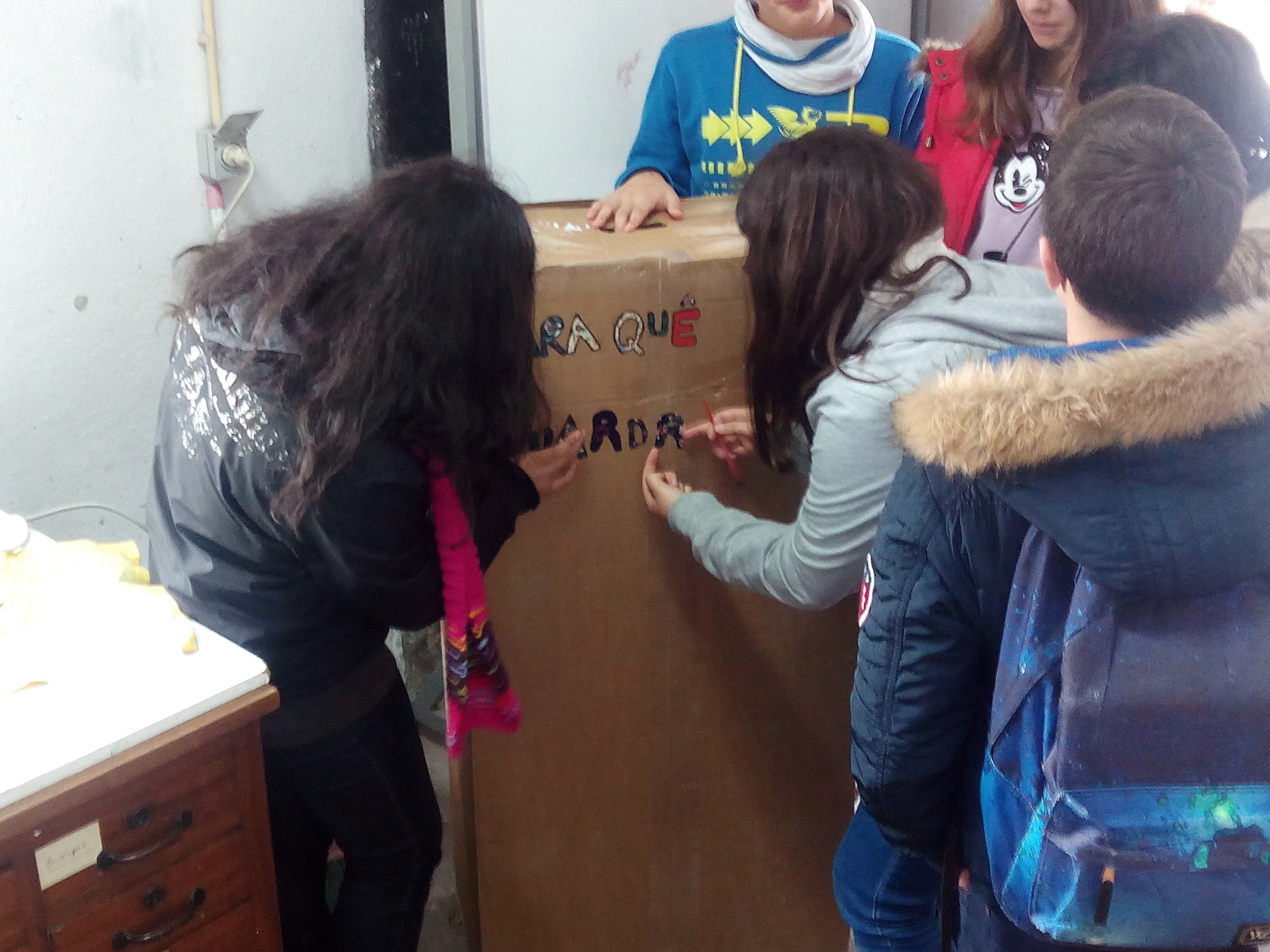 Os alunos transformaram uma caixa de papel usada num contentor de recolha de roupa.