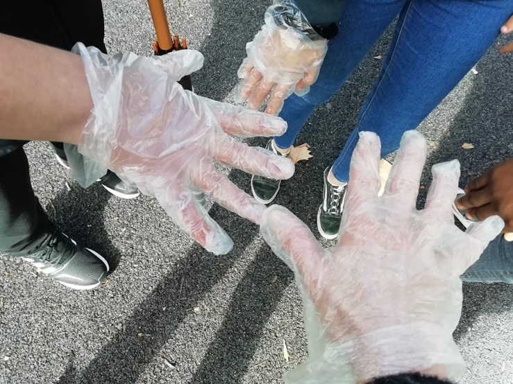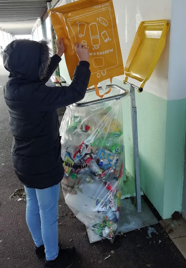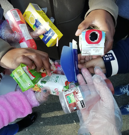 Em pares, e com o respetivo eco-bag, os alunos recolheram e fizeram a separação de resíduos encontrados no pátio da escola.