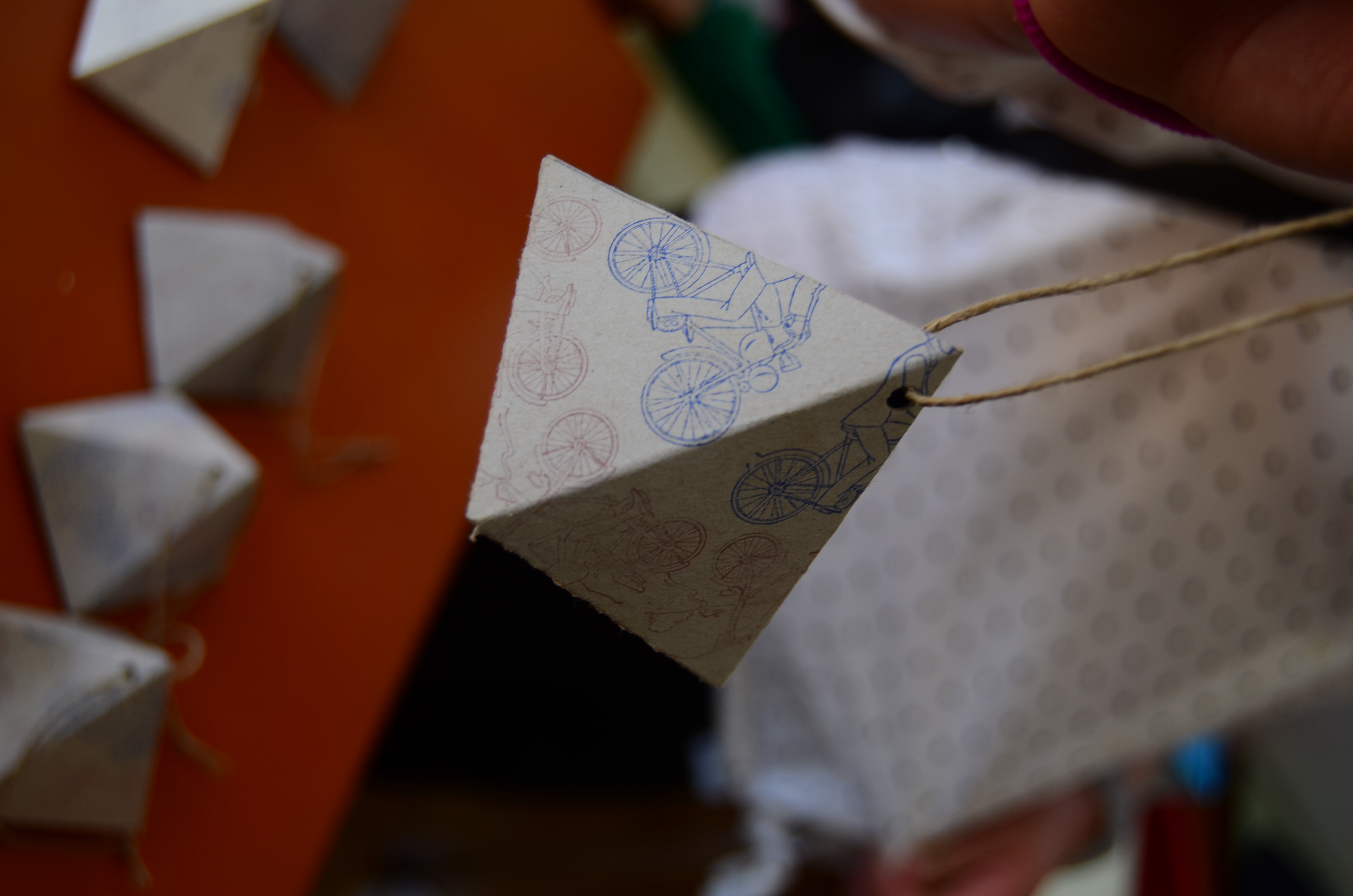 O Clube Eco-Escolas realizou pequenos ambientadores naturais com aroma de tuia e forma piramidal para oferecer aos alunos das outras escolas que interagiram nesta atividade. Para a realização dos mesmos recorreu à reutilização de embalagens de cartão de cereais que encheu com resíduos de tuia triturada. O exterior destes ambientadores foi carimbado com imagens de bicicletas numa alusão à mobilidade sustentável.