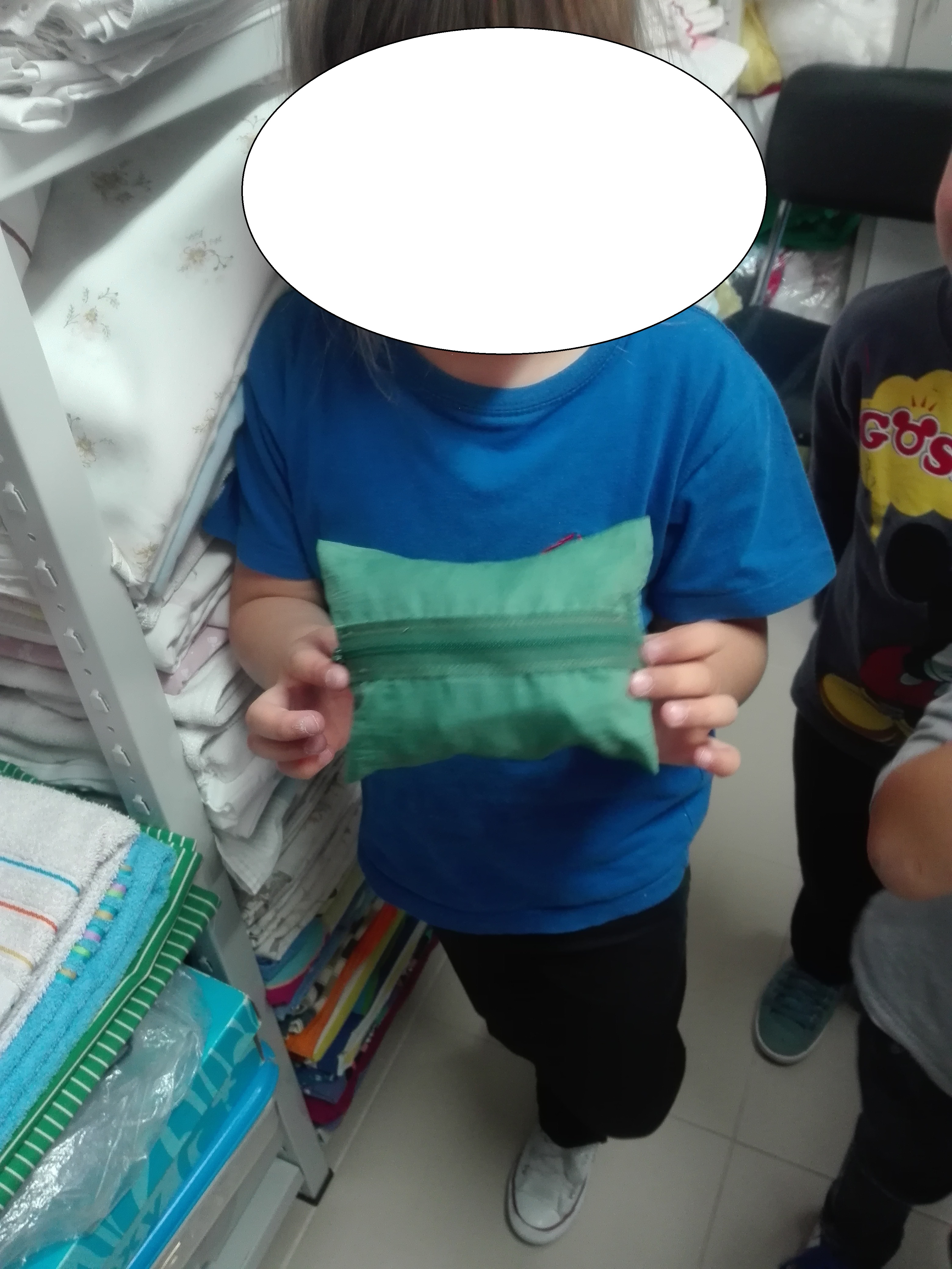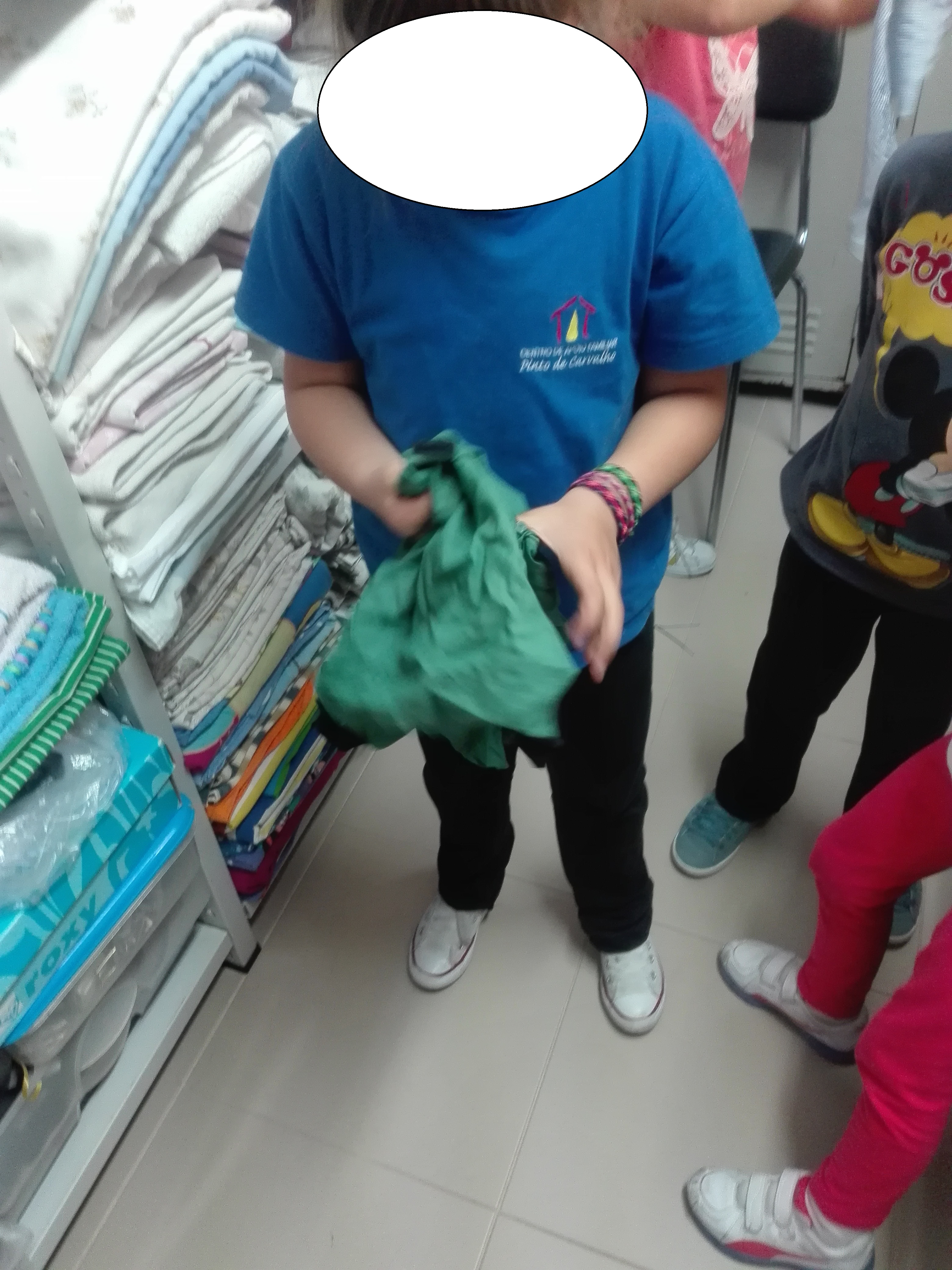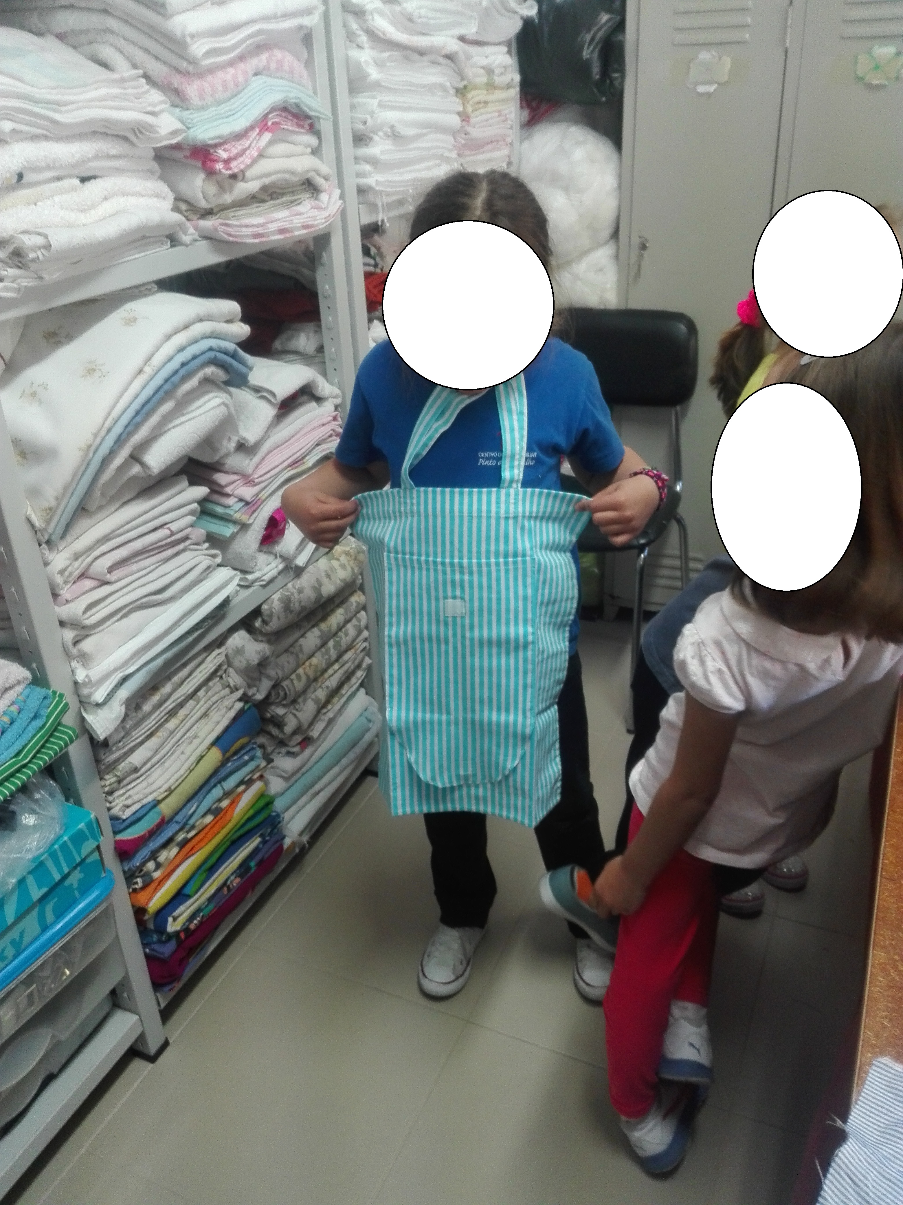 As crianças da sala dos 5 anos estiveram na rouparia da instituição, onde escolheram tecidos usados provenientes de diversas peças de roupa, toalhas de mesa, lençóis,… assistiram à confeção de um saco e aprenderam também a dobrar os sacos. As funcionárias da rouparia participaram na confeção dos sacos.
