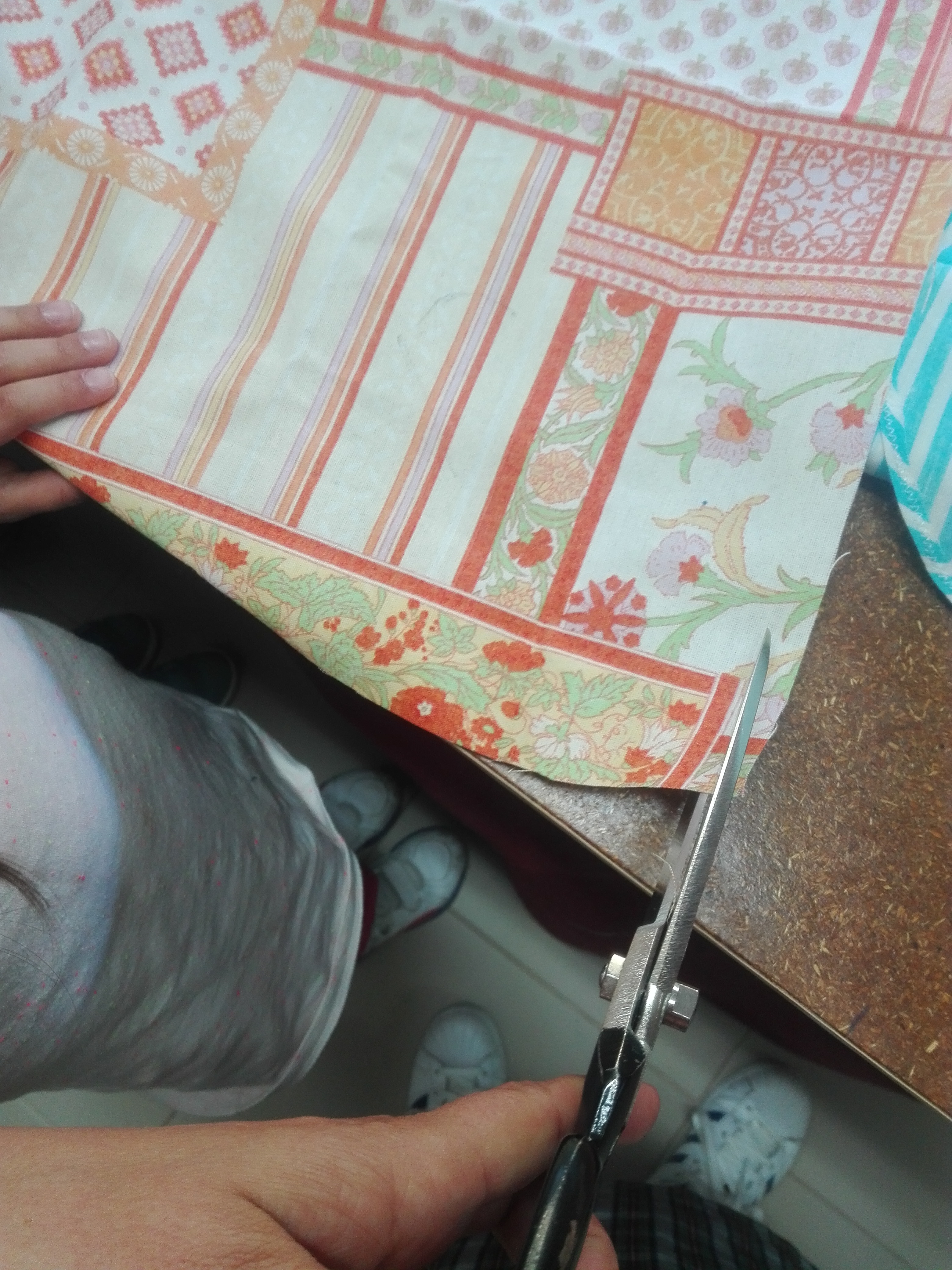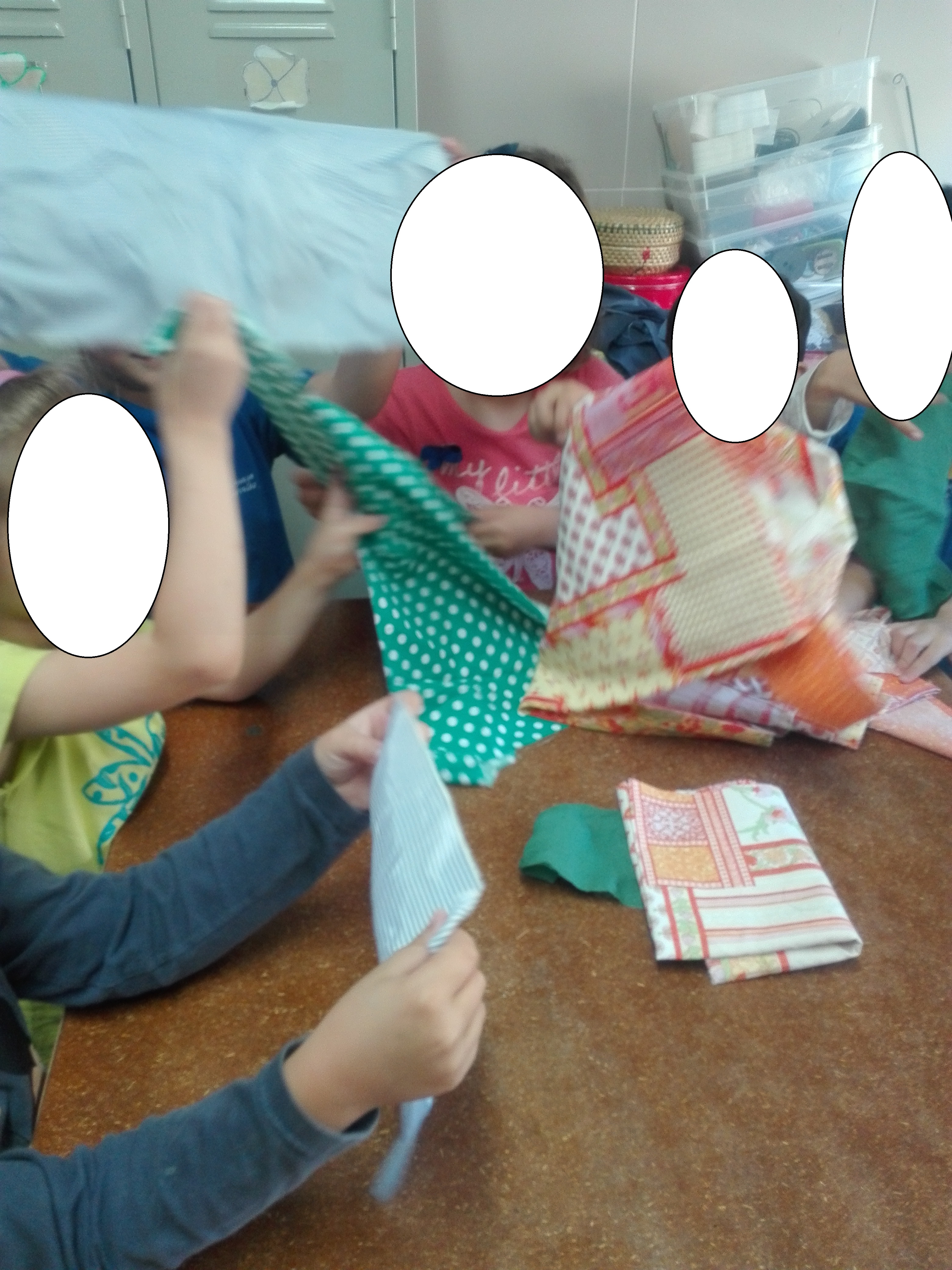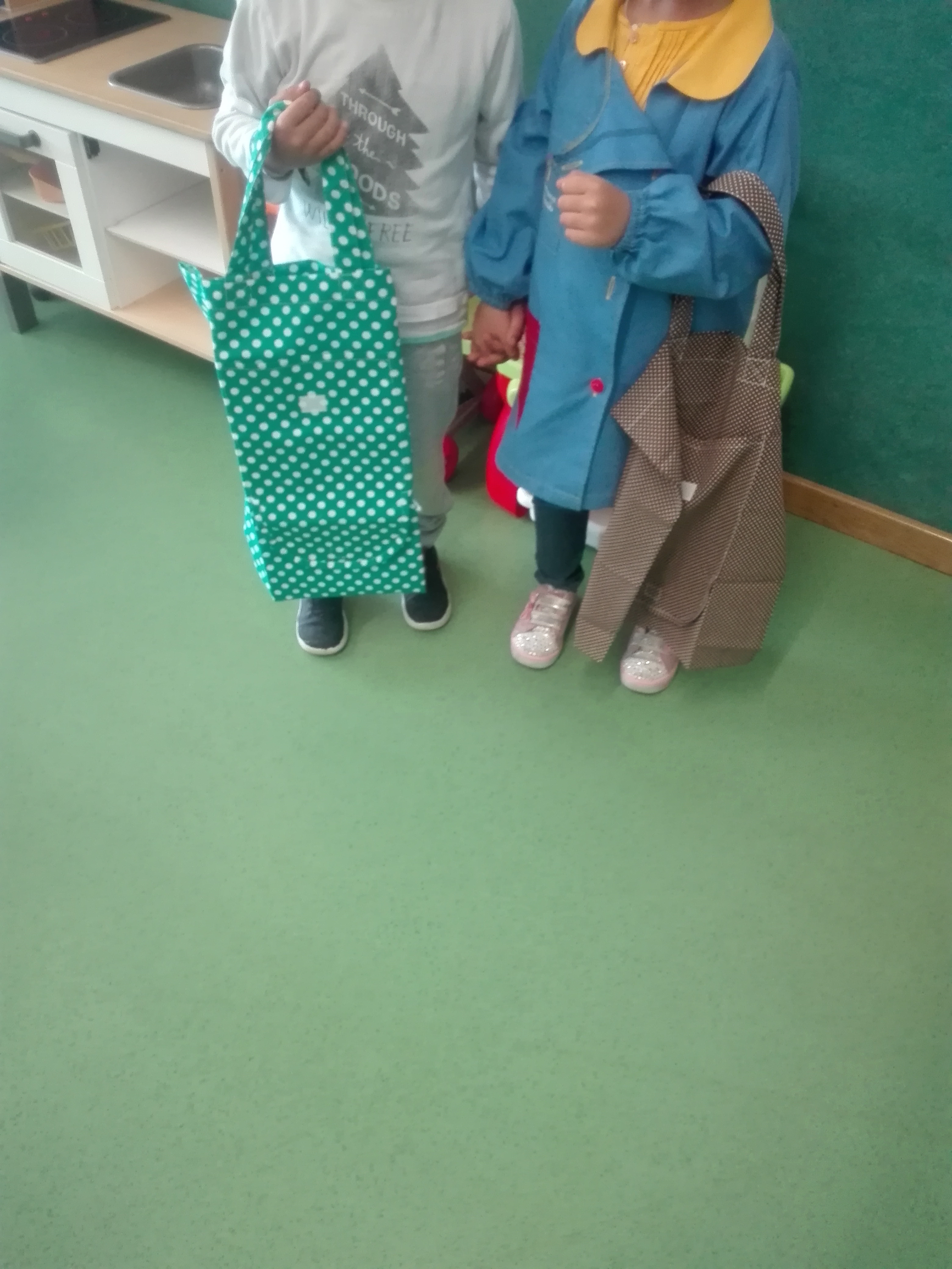 As crianças da sala dos 5 anos estiveram na rouparia da instituição, onde escolheram tecidos usados provenientes de diversas peças de roupa, toalhas de mesa, lençóis,… assistiram à confeção de um saco e aprenderam também a dobrar os sacos. As funcionárias da rouparia participaram na confeção dos sacos.