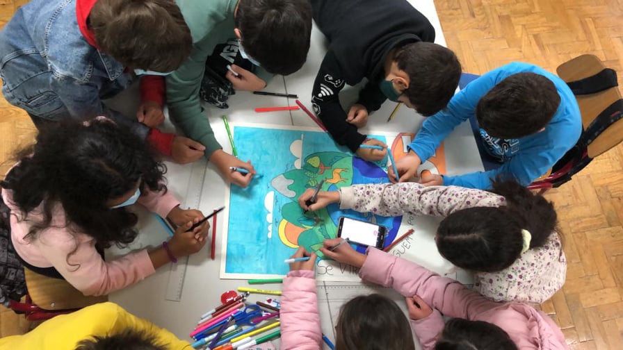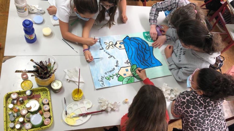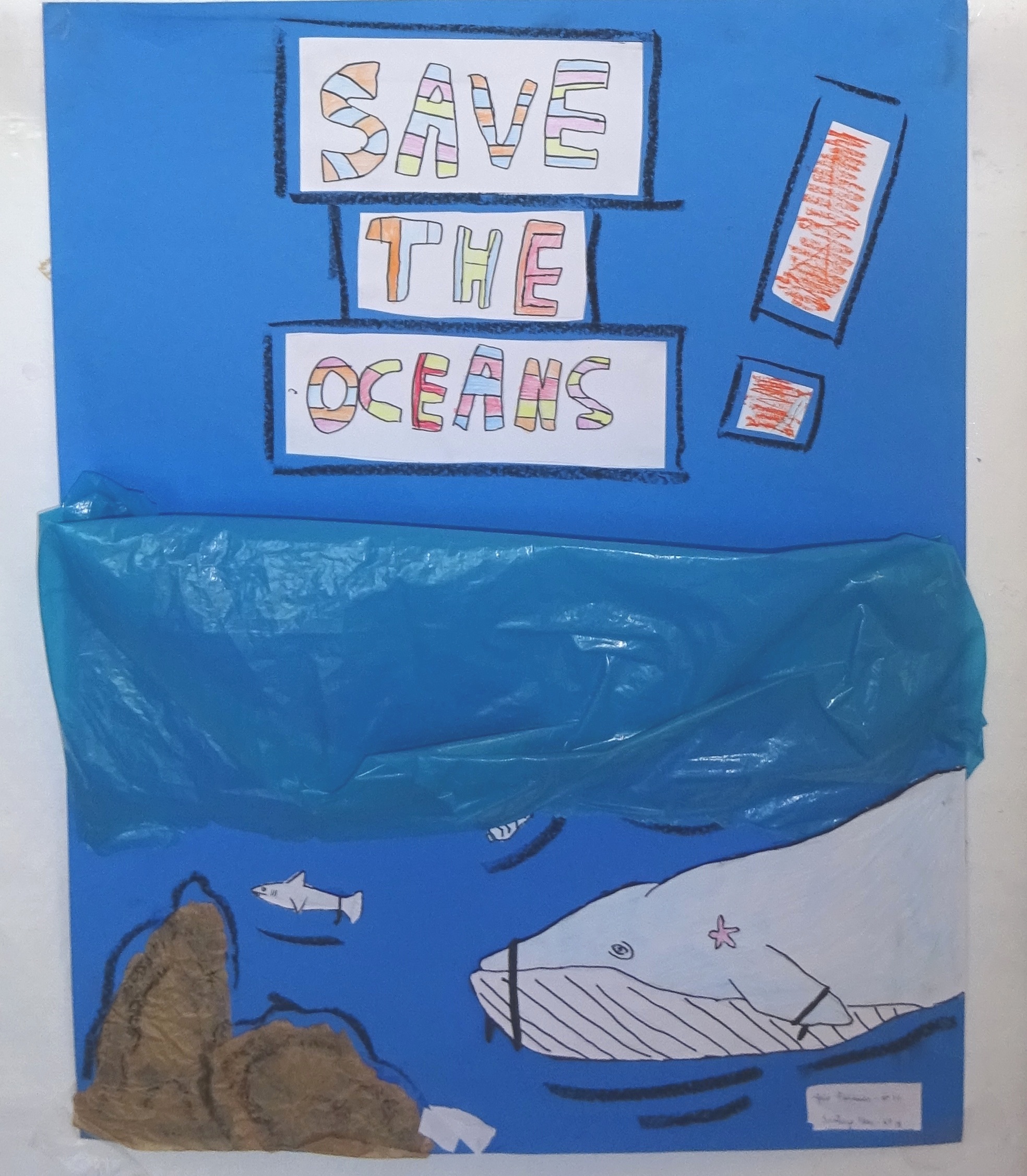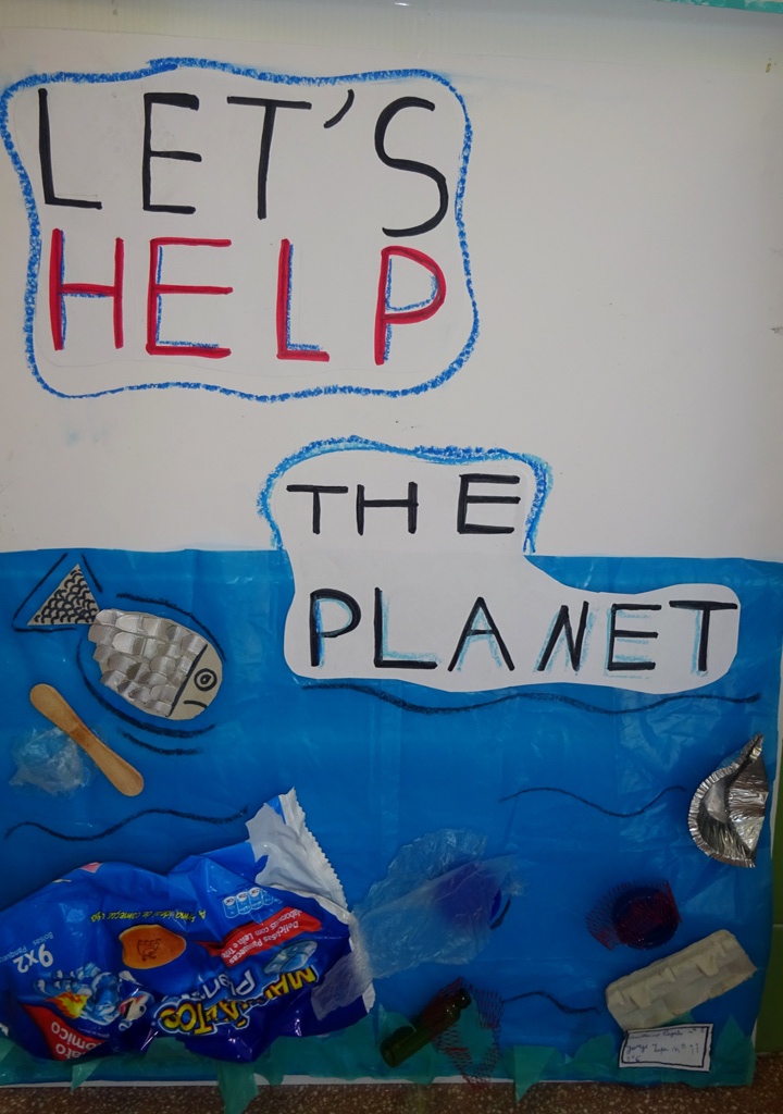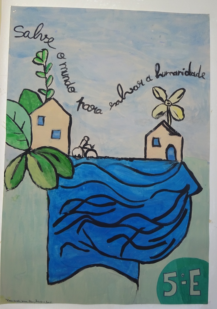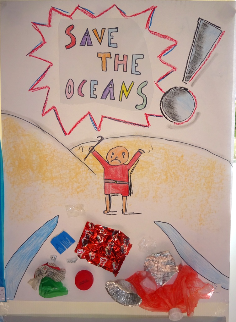 Os alunos desenharam os oceanos com frases de alerta: THE SEA IS DYING; SAVE THE OCEANS