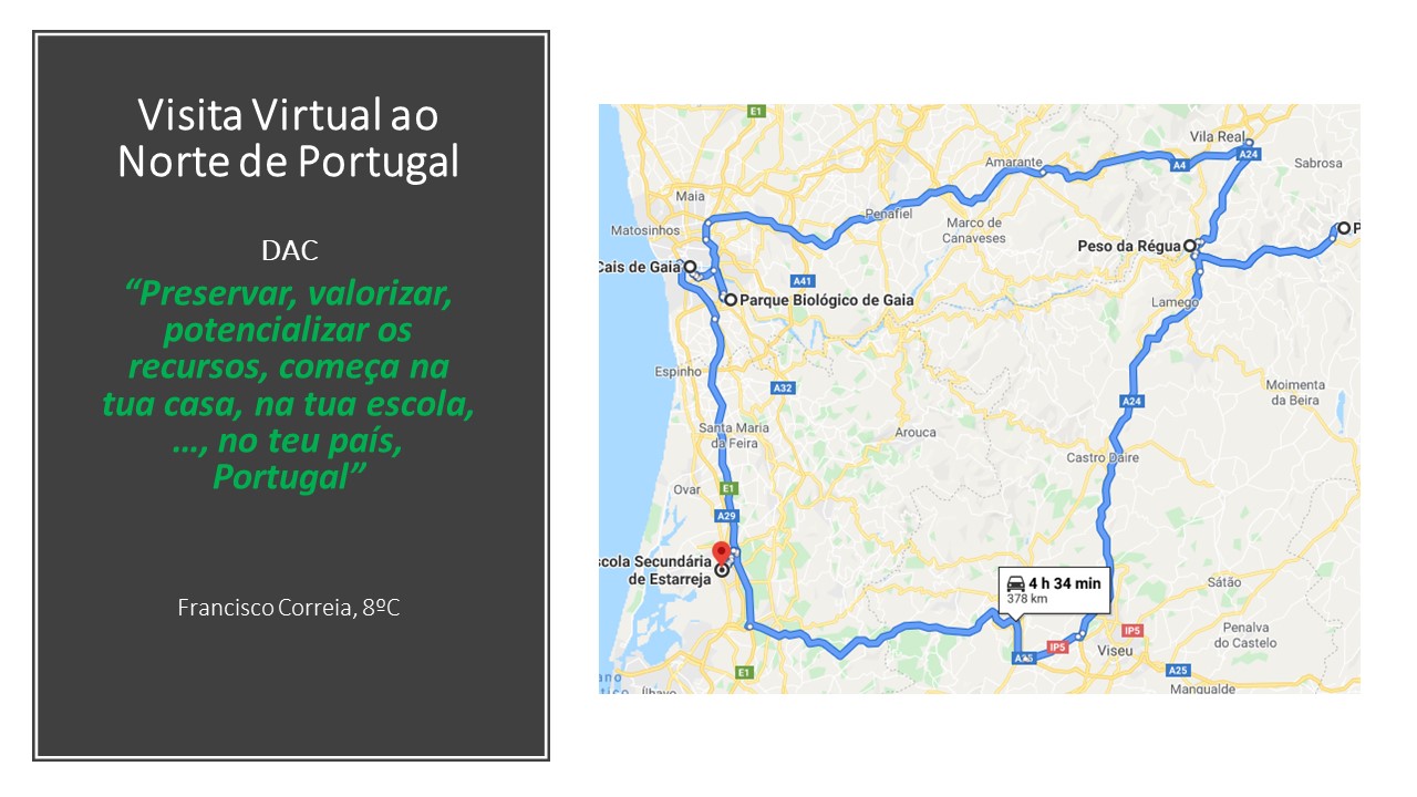 No âmbito do desafio lançado na SEMANA ECO pela docente Fátima Silva aos alunos do 8.º ano, com a temática Visita Virtual ao Norte de Portugal, inserida no DAC “Preservar, valorizar, potencializar os recursos, começa na tua casa, na tua escola, …, no teu país, Portugal” divulgamos um dos trabalhos realizados, da autoria do aluno, Francisco Correia, da turma C do 8º ano.