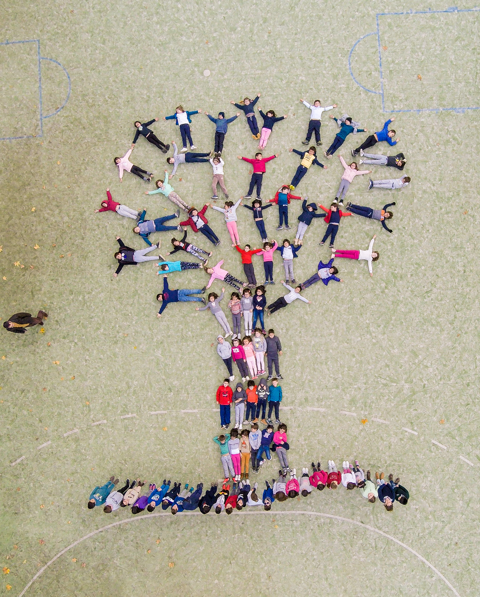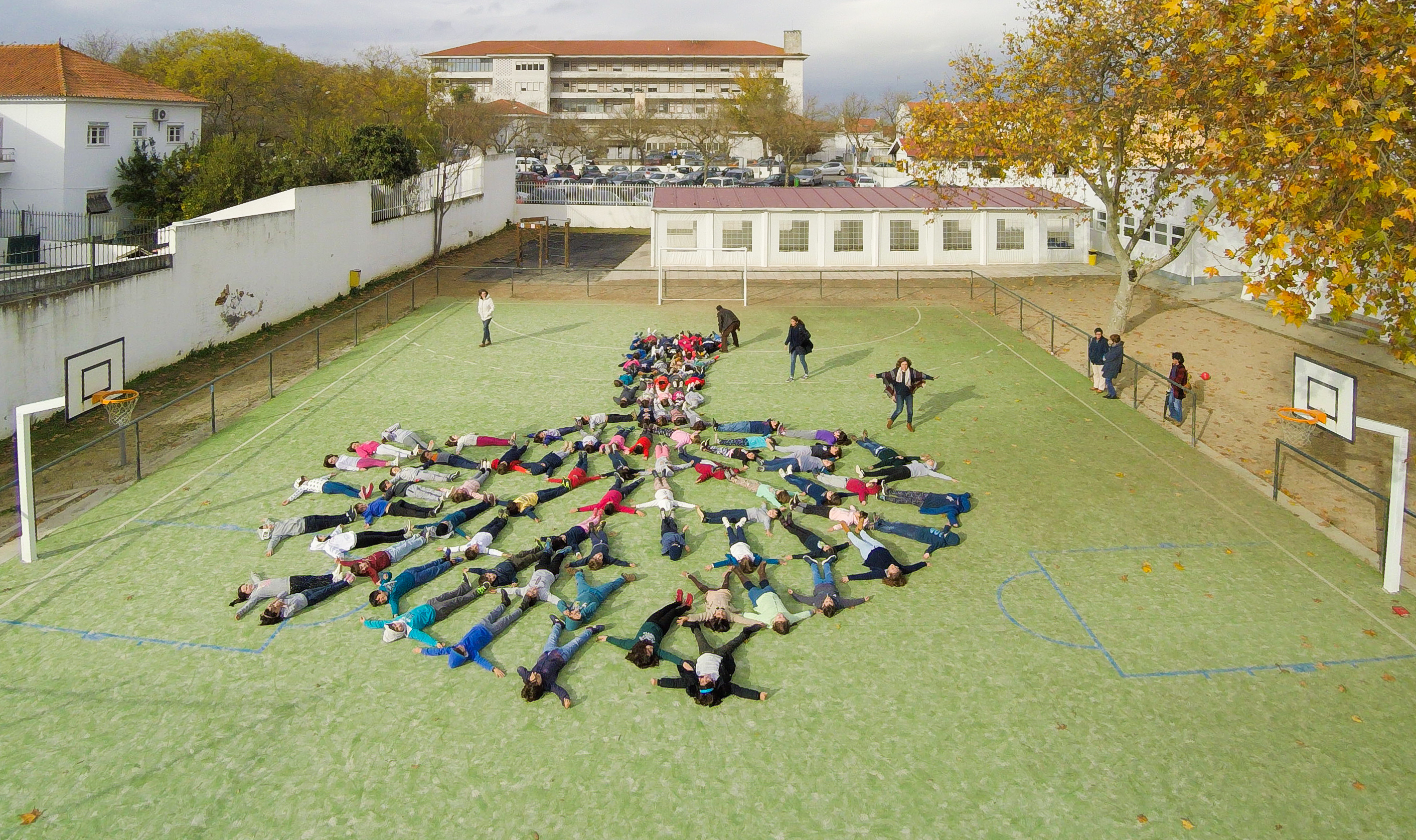 Formar uma árvore com os alunos da escola. Divulgar a foto (feita com recurso a um drone) primeiro nas páginas da escola e do Agrupamento e, posteriormente no jornal do Agrupamento e em cartazes na comunidade envolvente.