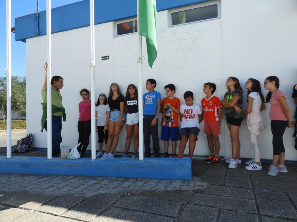 1.ª – Os alunos juntaram-se junto à Bandeira Eco-Escola, lá foi-lhes explicado o significado da Bandeira estar a meia haste e foi pedido que transmitissem essa ideia nas respetivas casas, pois os Pais e Encarregados de Educação também repararam na Bandeira a meia haste.