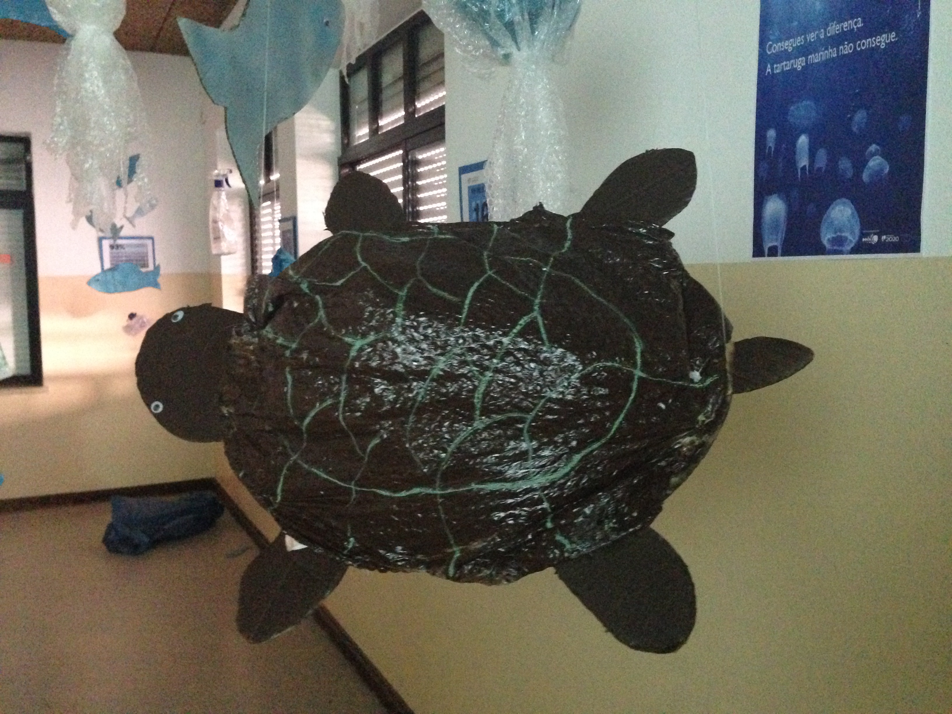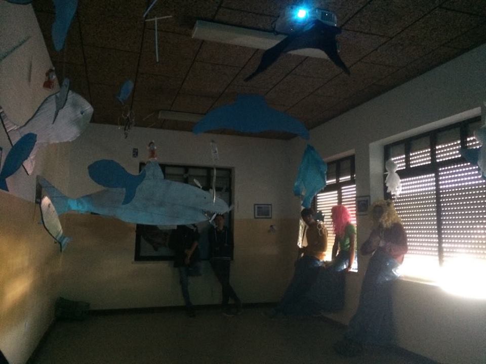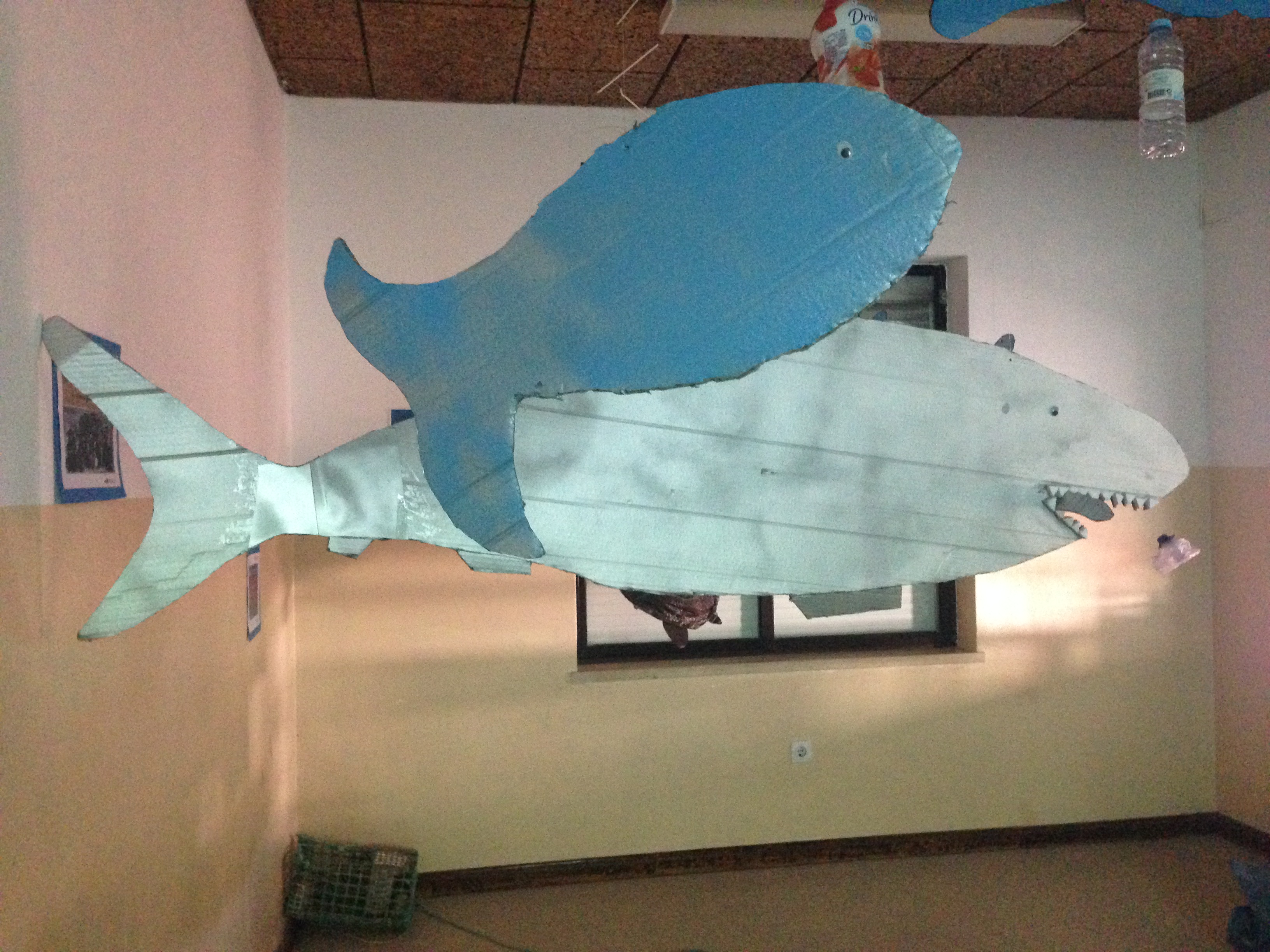 - Decoração da sala de aula de forma a simular o fundo dos oceanos, representando várias espécies marinhas como tubarões, baleias, peixes e tartarugas, assim como os plásticos, nomeadamente garrafas, palhinhas e sacos.